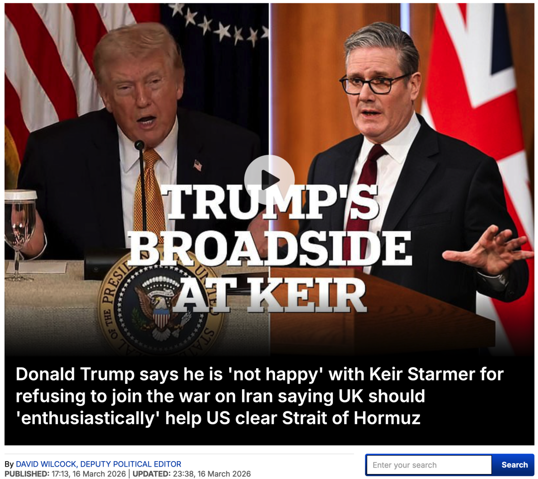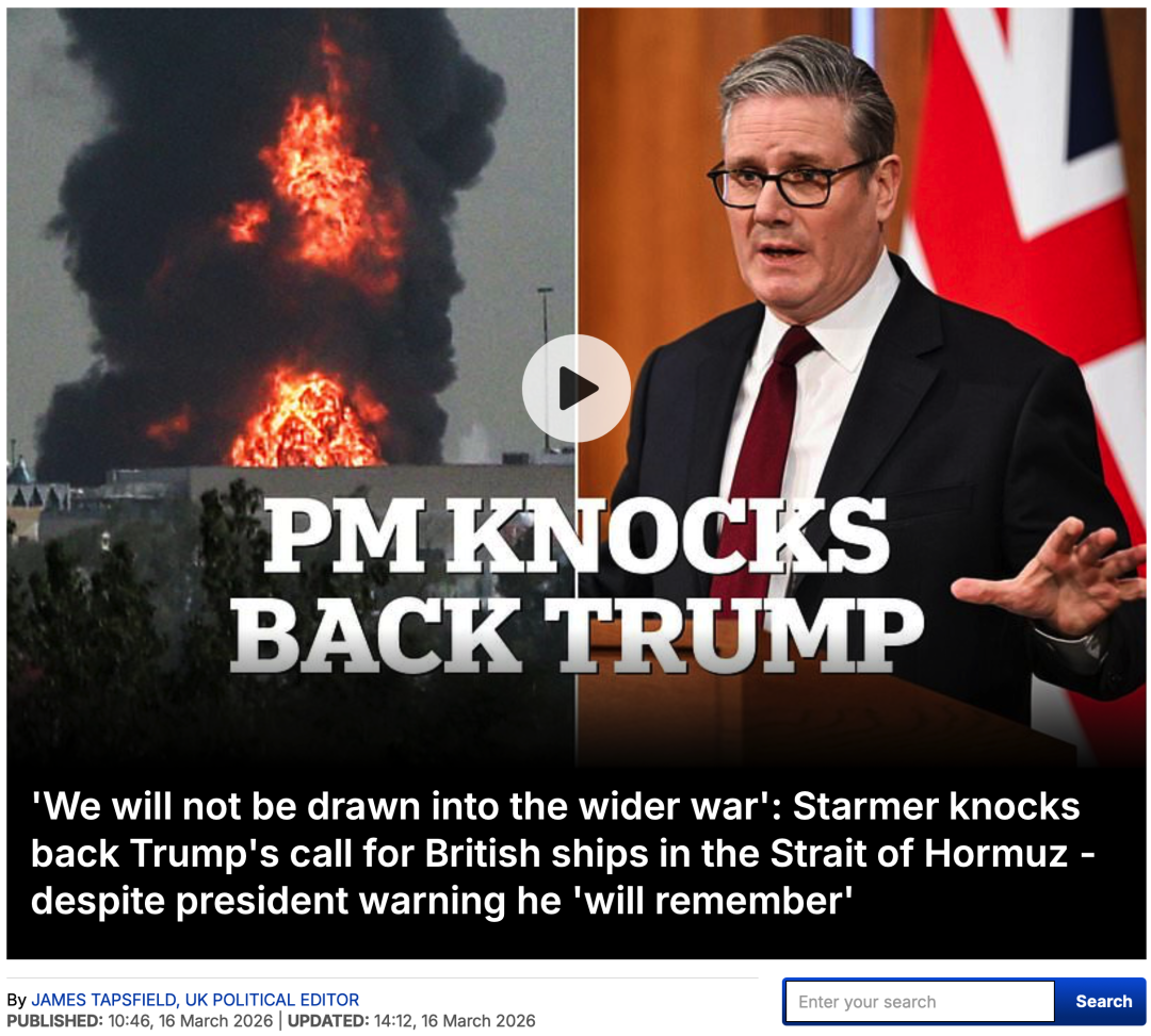 3月16日,英国首相斯塔默在唐宁街举行的新闻发布会上公开拒绝了美国总统特朗普提出的,要求“各国派军舰到霍尔木兹海峡保护邮轮及商船”的呼吁。斯塔默坚称,英国不会被卷入”中东更广泛的战争“,且希望看到“这场战争尽快结束”。