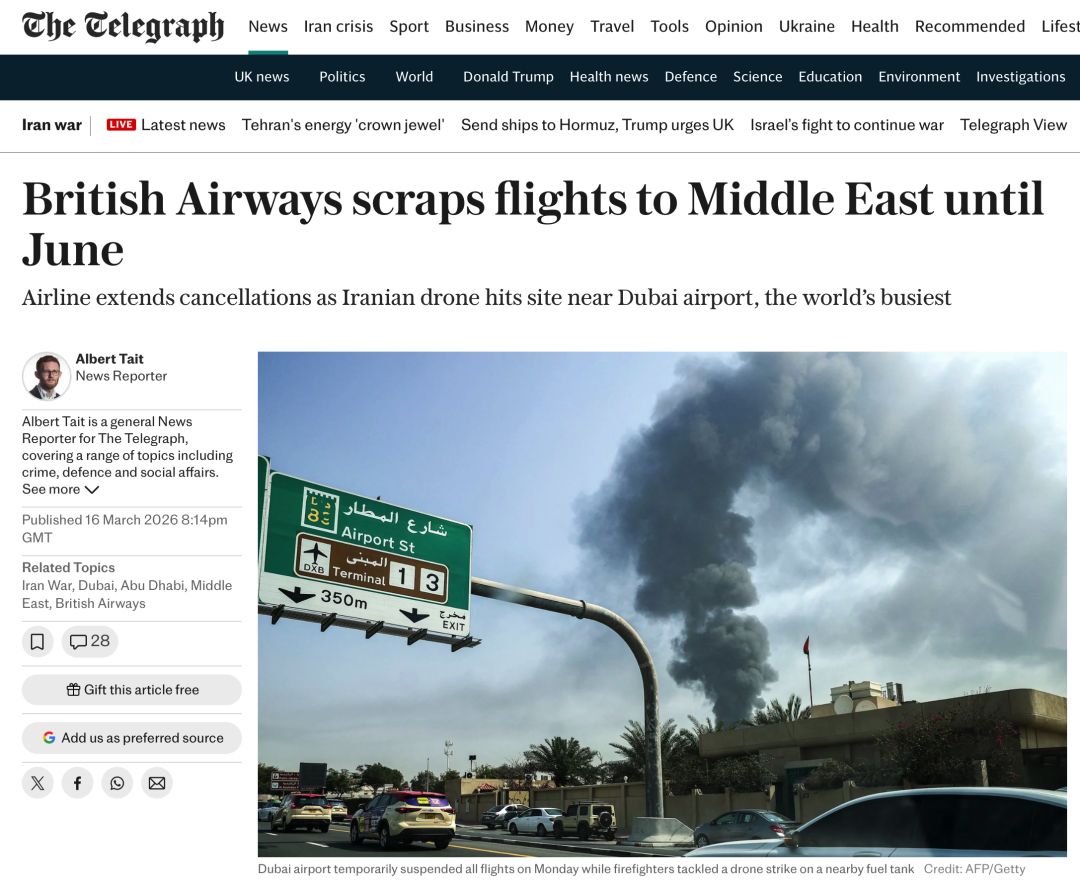 英国媒体最新获悉,迪拜机场在关闭7小时后重开。然而,英国航空公司依然在事件发生后宣布,取消5月31日之前所有飞往迪拜、安曼、巴林或特拉维夫的航班,取消4月底之前飞往卡塔尔多哈的航班,取消所有飞往阿布扎比的航班直至另行通知。